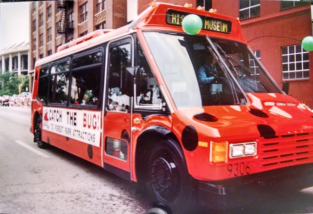 Return to BlogANSWER: Pictured below is a Forest Park “Shuttle Bug” at a promotional event next to the old Busch Stadium in 1993.